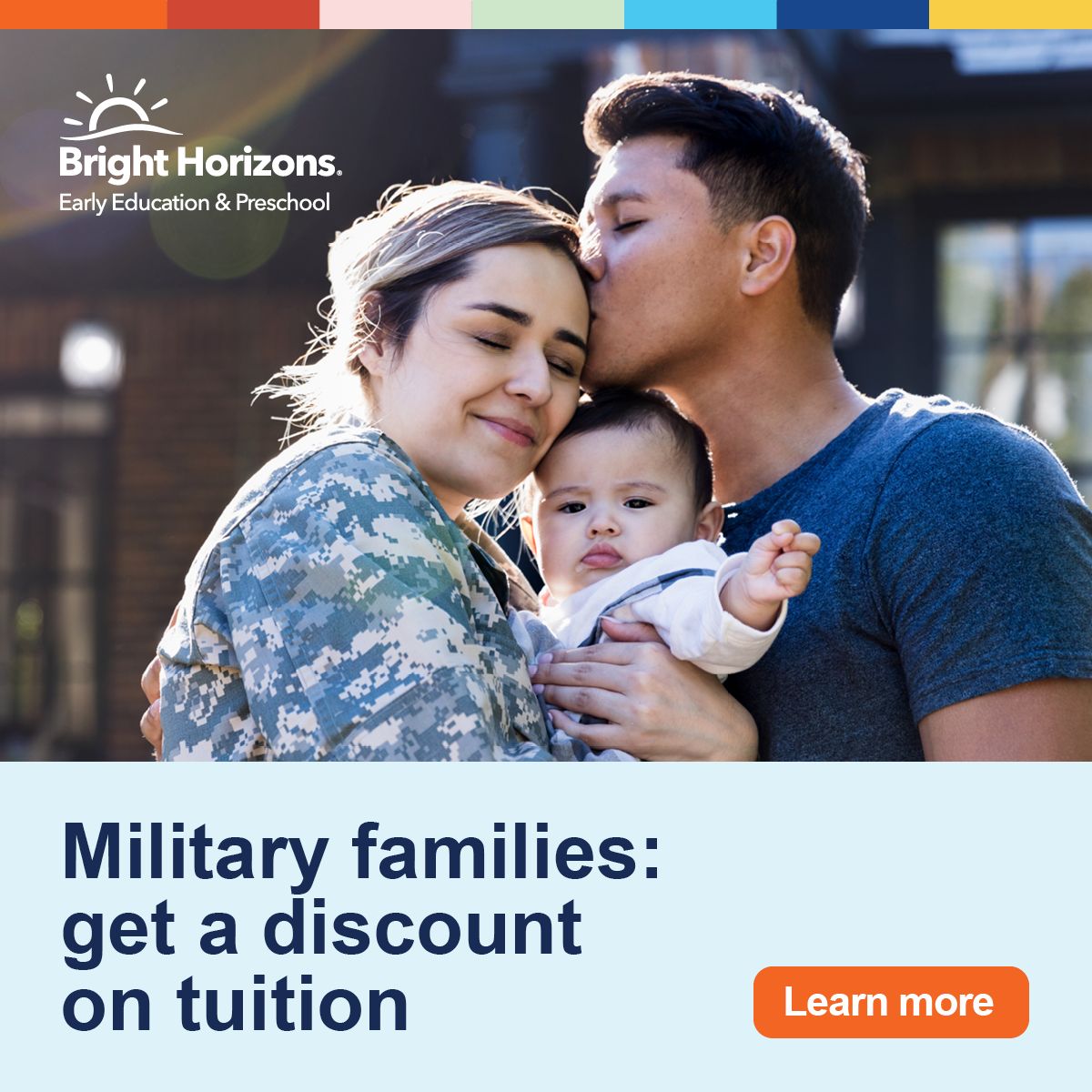 Bright Horizons® proudly partners with the Military Child Care in Your Neighborhood (MCCYN) program operated by Child Care Aware of America (CCAoA) and Navy Child and Youth Programs (CYP) to offer exceptional early education and care for eligible military children. You even have tuition assistance and a waived registration fee* at participating centers!