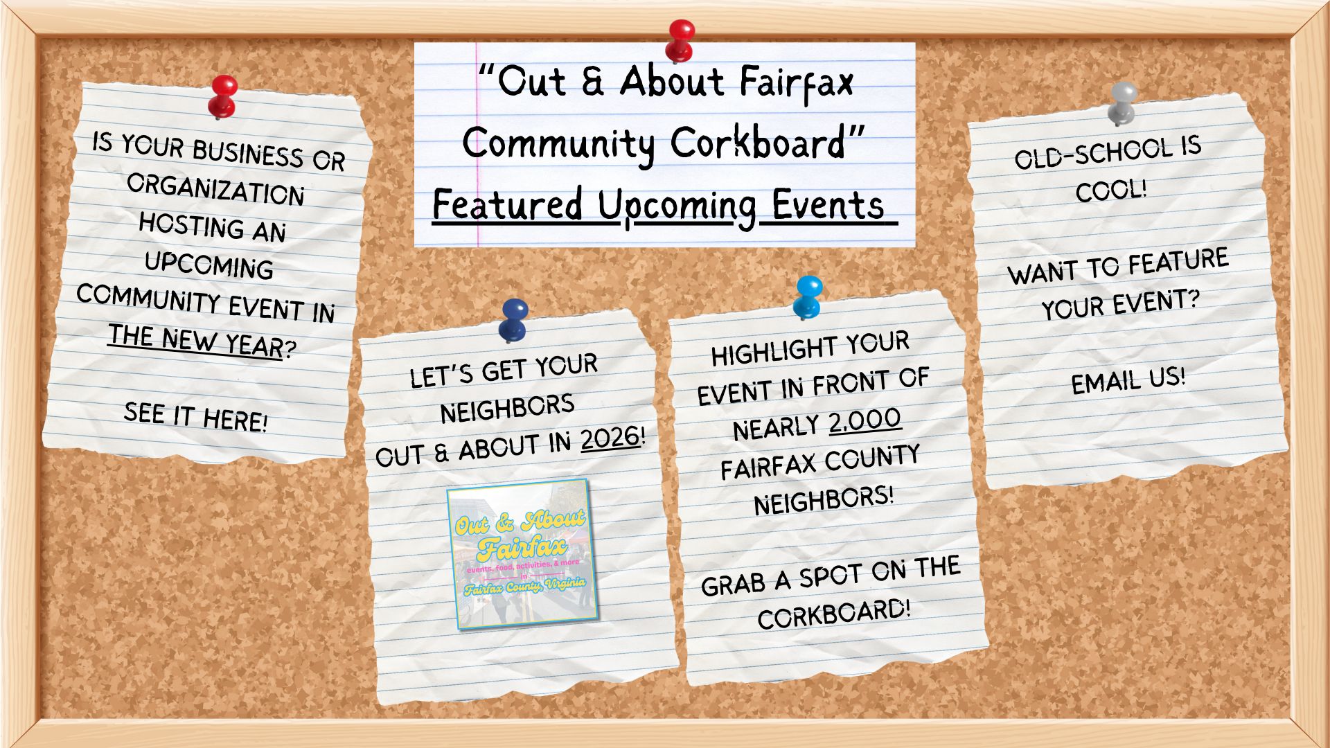 The Community Corkboard is a great way to promote your event weeks in advance and to invite your neighbors Out & About!